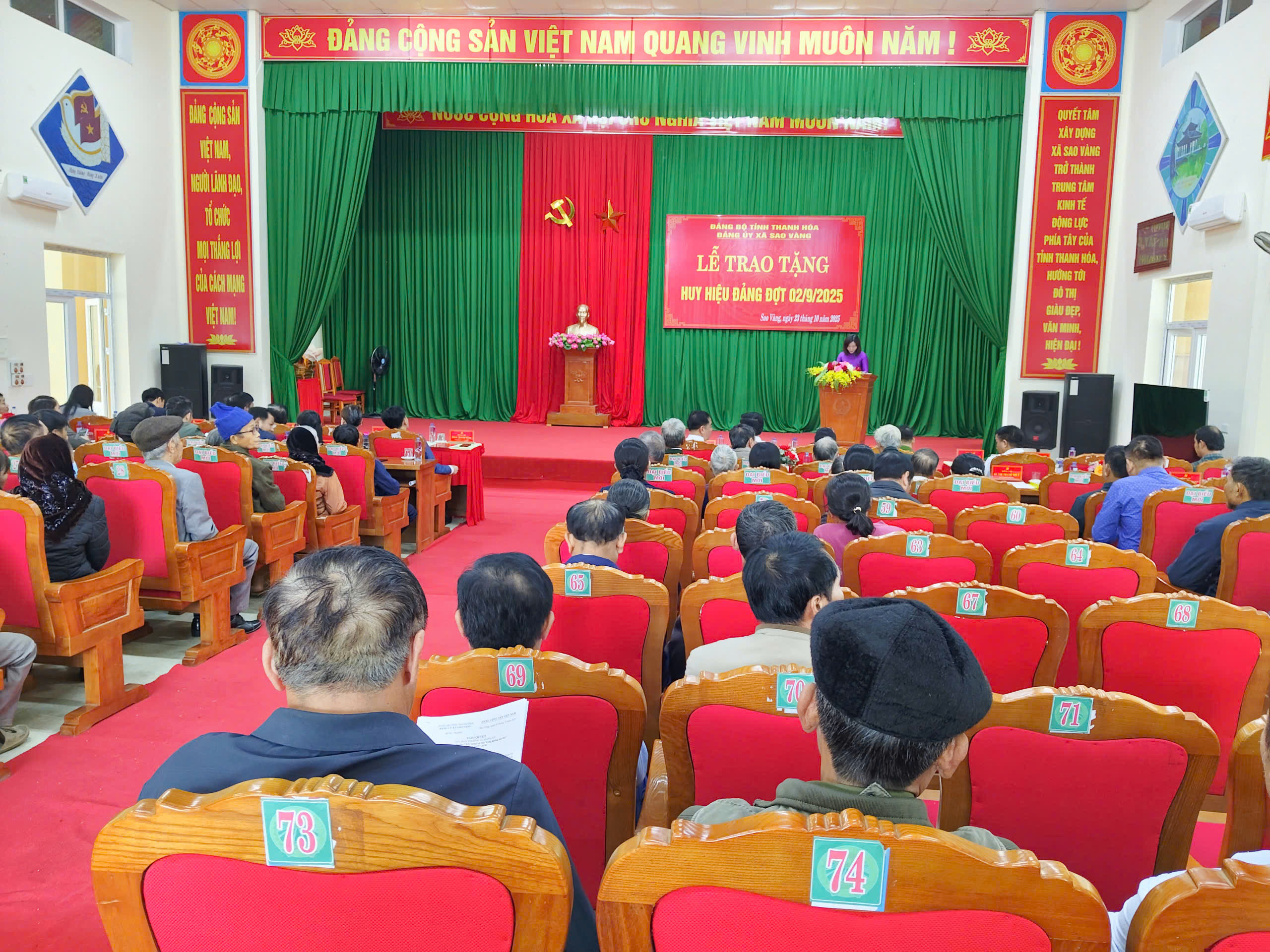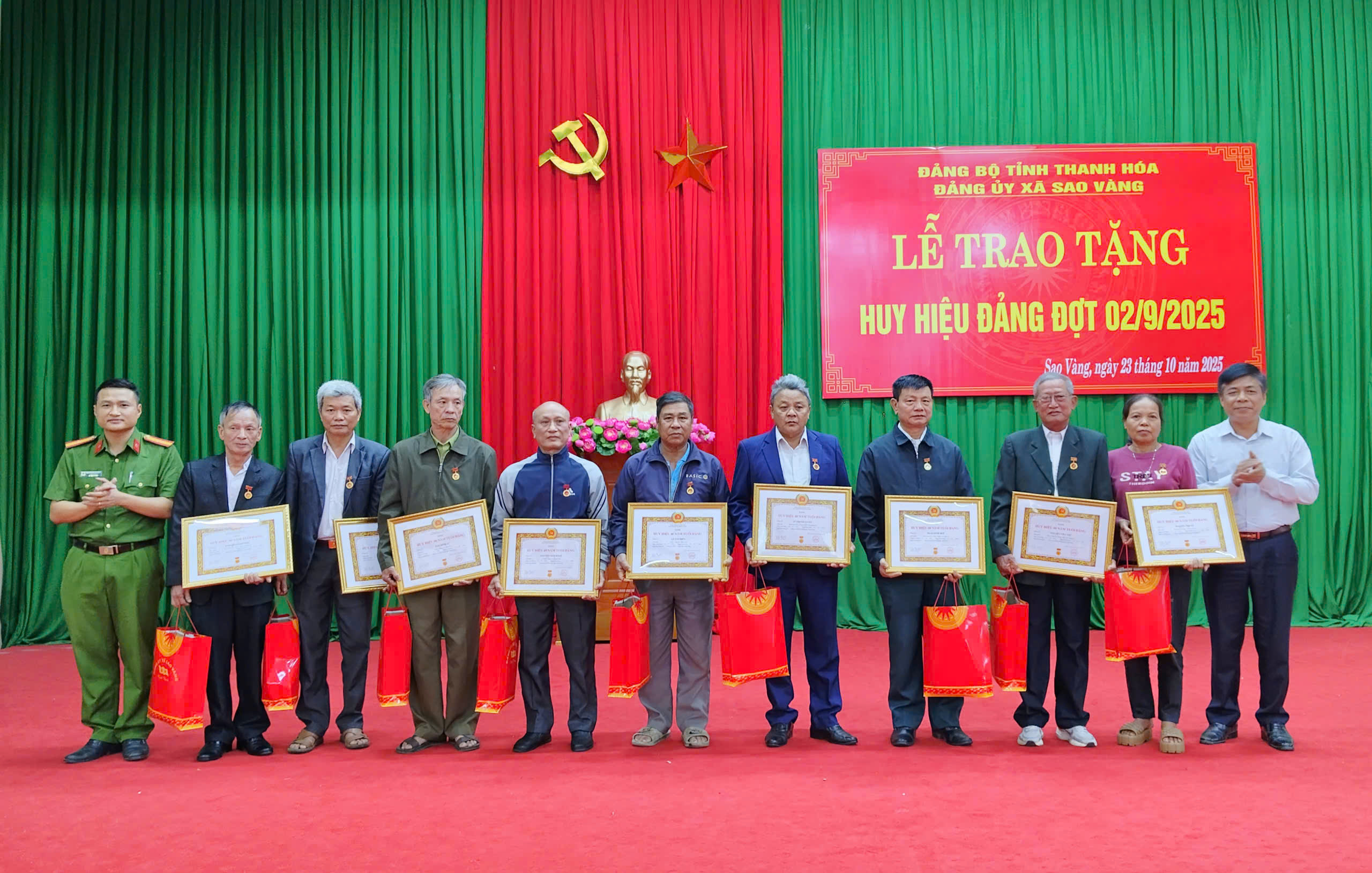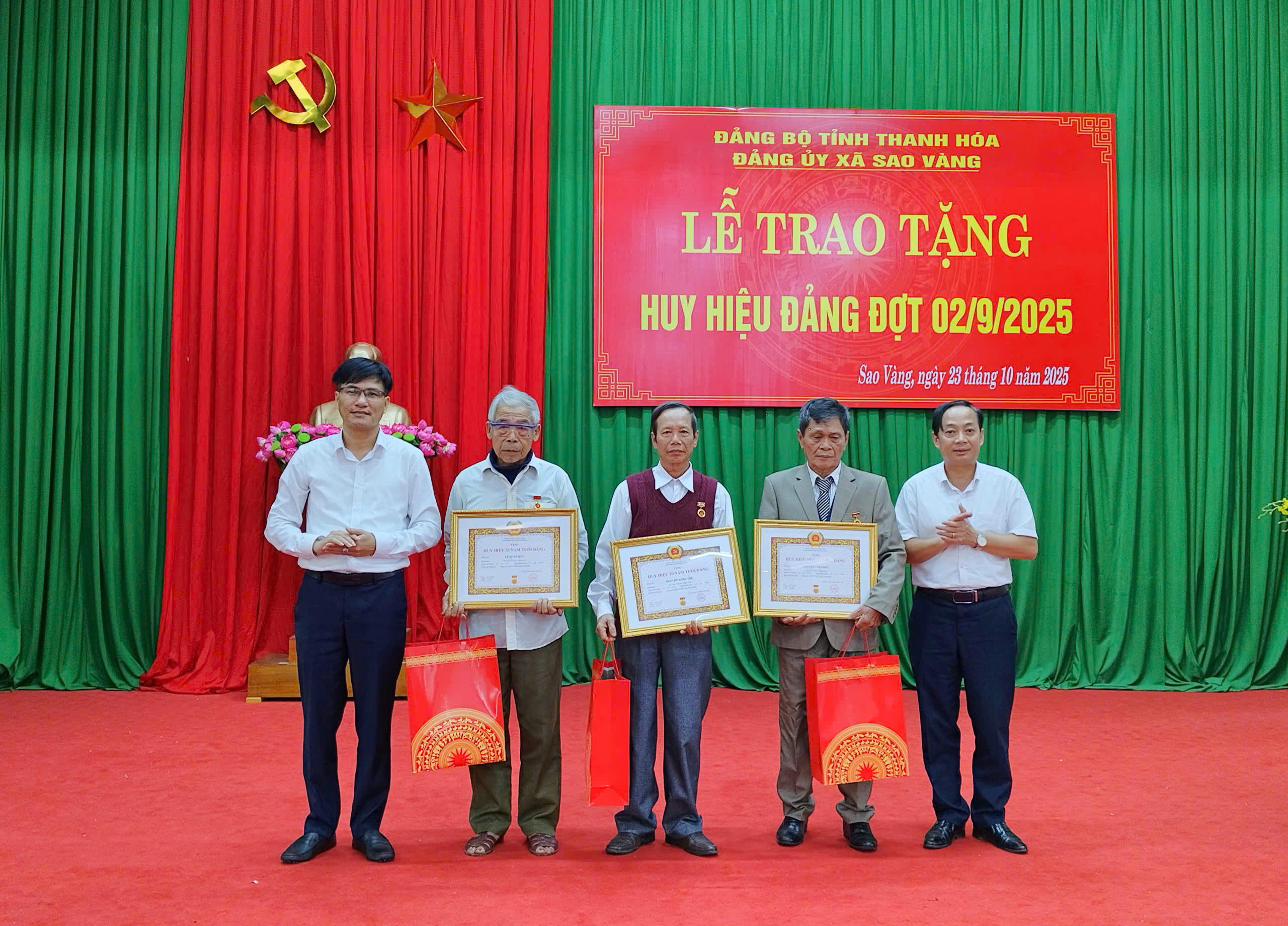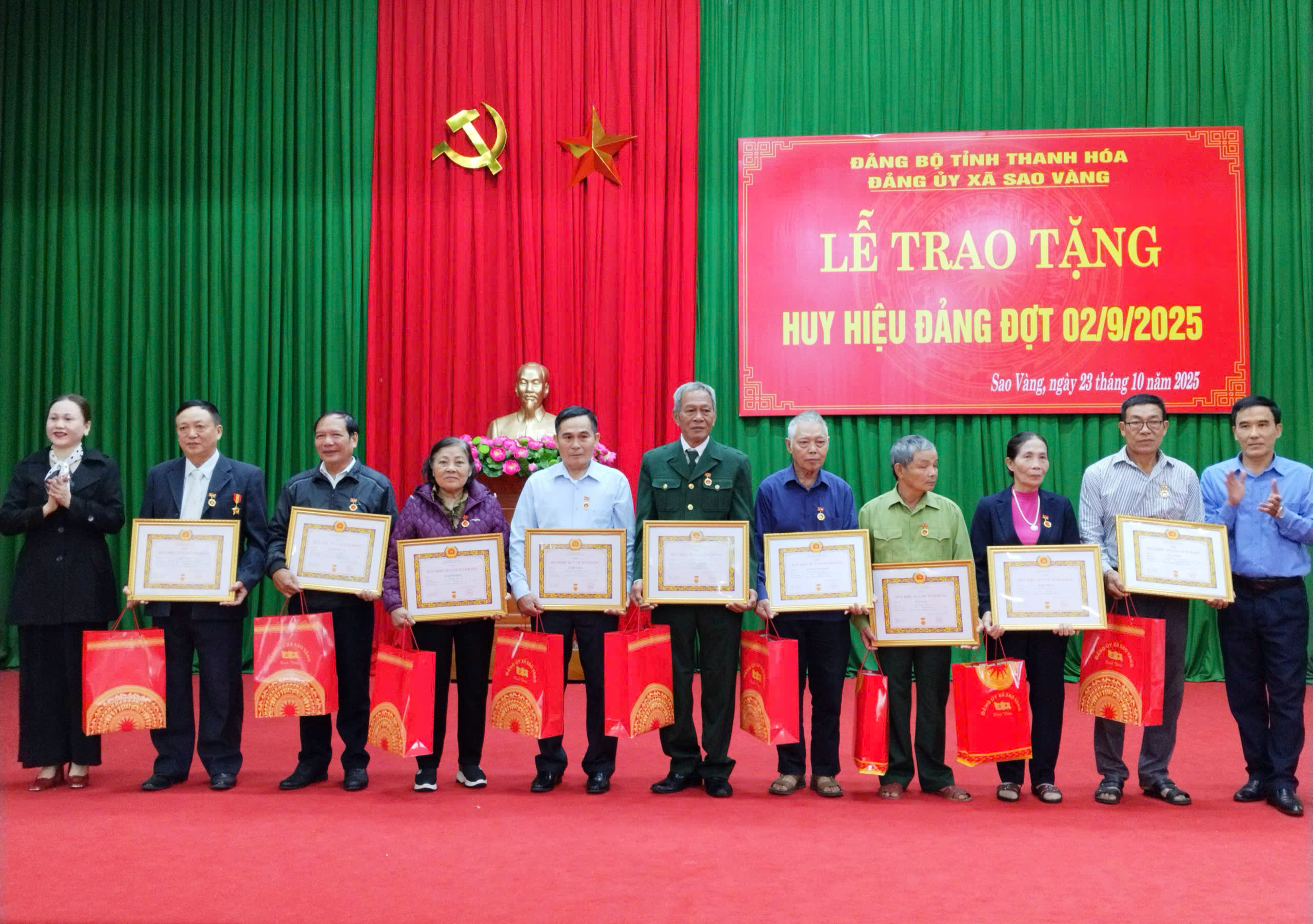 Tại buổi lễ, các đồng chí lãnh đạo xã Sao Vàng đã trao tặng Huy hiệu Đảng cho các đảng viên được trao tặng Huy hiệu Đảng đợt 02/9/2025.
