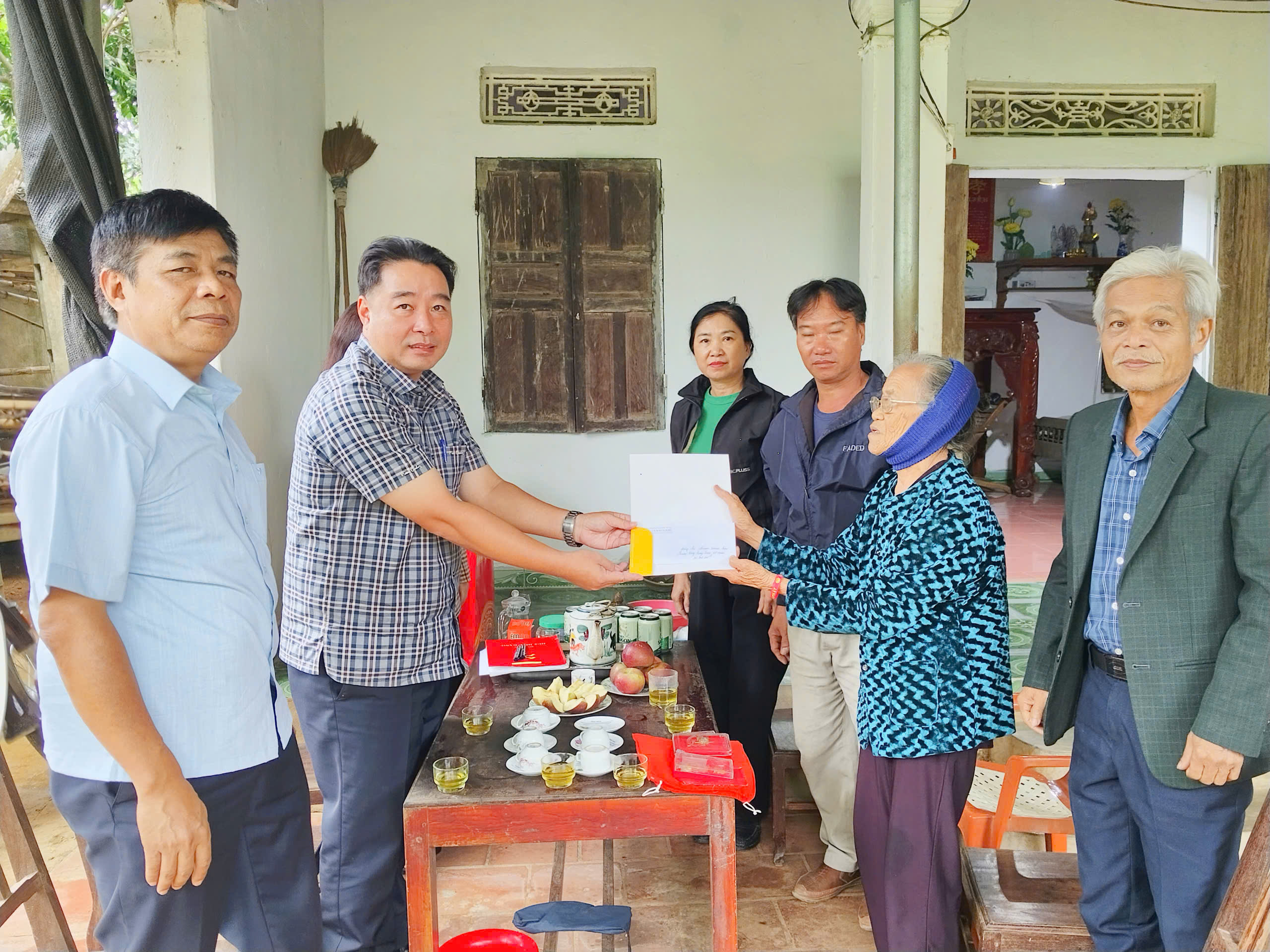 (Đồng chí Nguyễn Minh Hoàng, Ủy viên BCH Đảng bộ tỉnh, Bí thư Đảng ủy xã Sao Vàng trao huy hiệu 60 năm tuổi Đảng cho thân nhân đảng viên Phạm Xuân Bái, sinh năm 1942 (đã mất))
